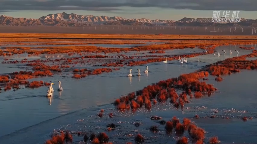 酒泉:成群天鹅在湿地游弋觅食